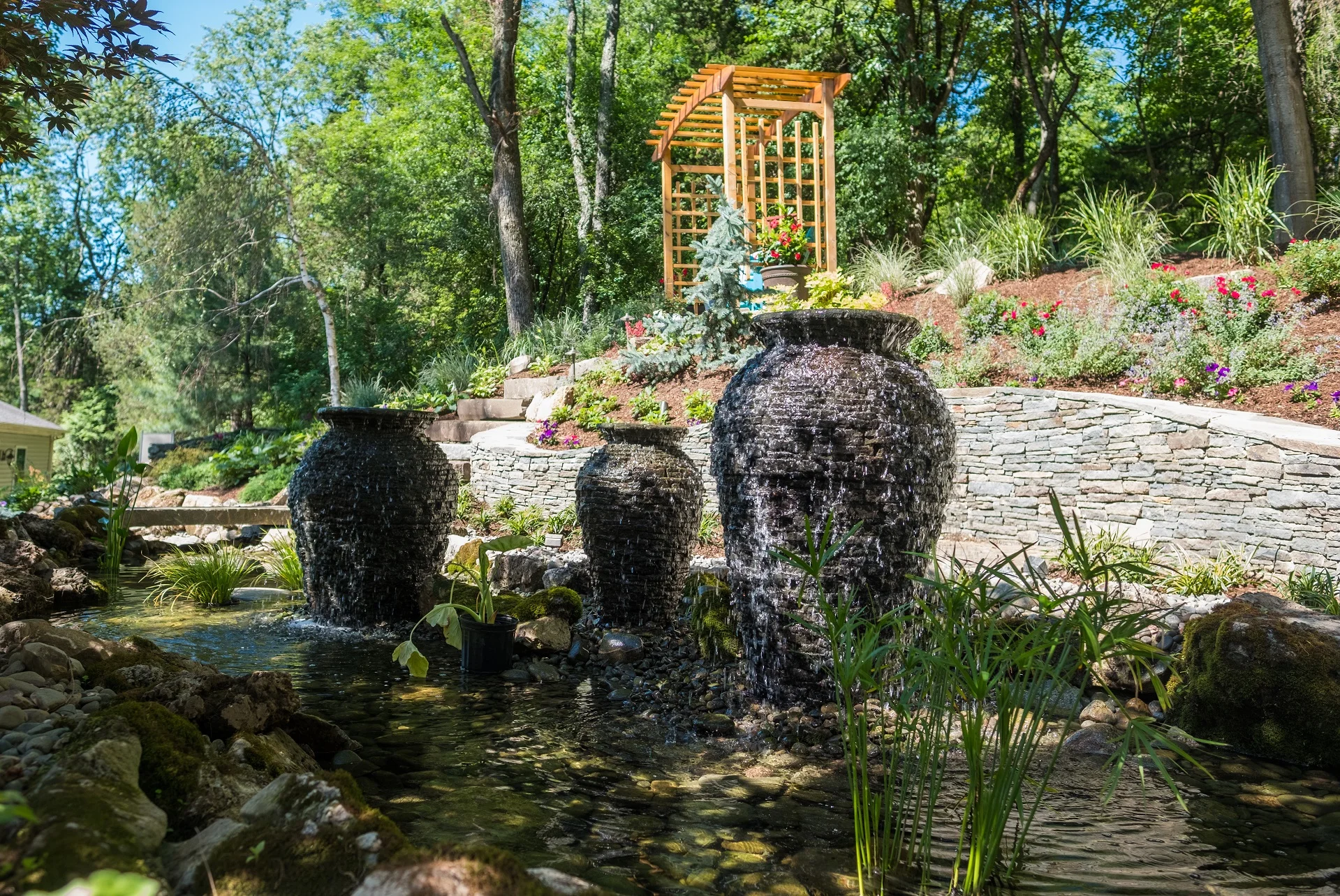 By working with the natural slope of this Goshen, NY backyard, our designers integrated an artistically inspired respite for hosting and relaxation. From top to bottom, this design utilizes extensive natural stone retaining walls, flowing water elements and private pockets for dining, relaxing and taking in the beauty of the surrounding ponds and waterfalls. Guest can weave around to a stone-stacked, custom outdoor fireplace and patio before following the stone stairways to the fully equipped outdoor kitchen. Arranged with a bar, dining area, barbecue and pergola, this comprehensive landscape overhaul blends natural beauty with dynamic hosting possibilities.